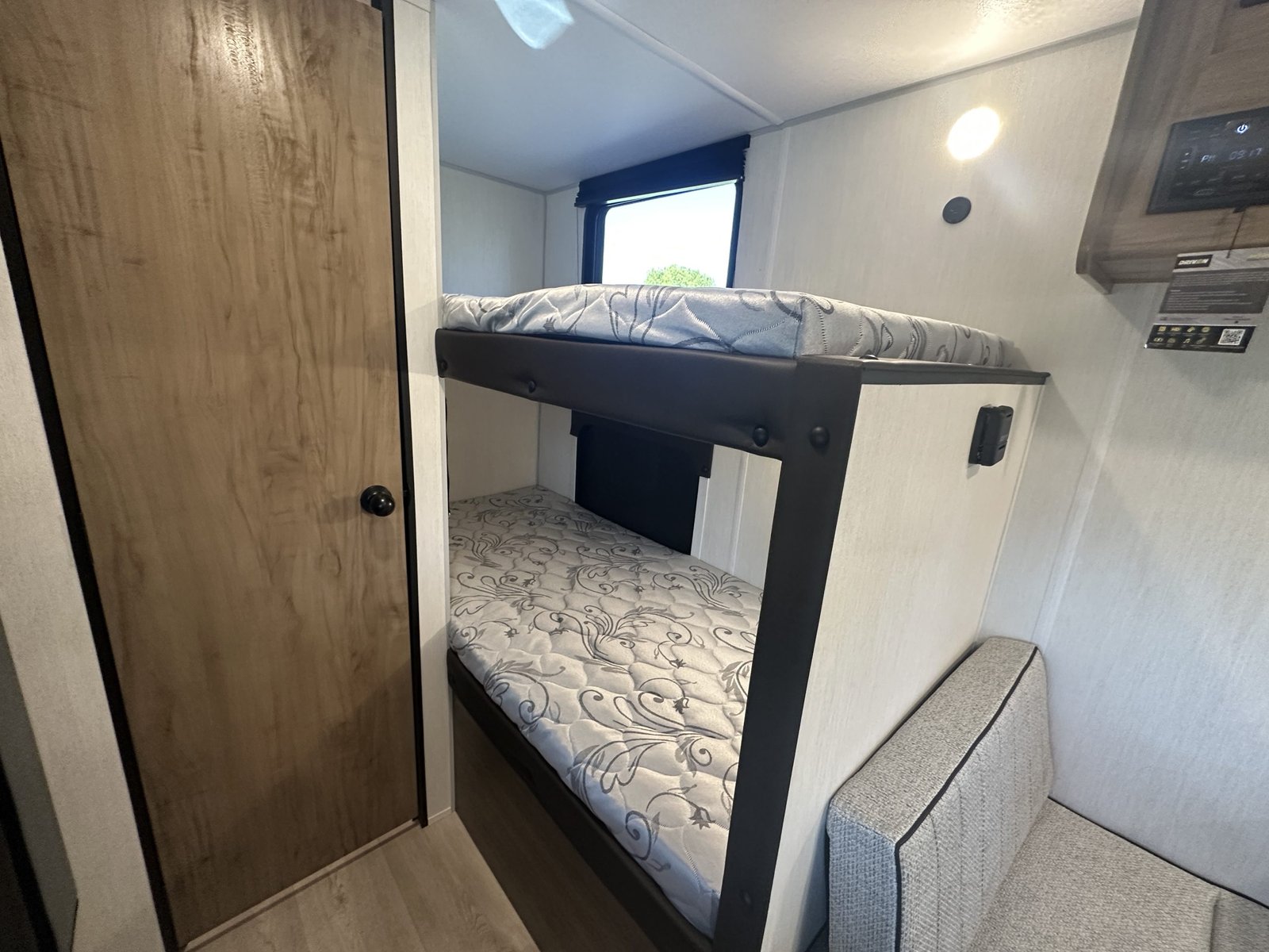 The Cherokee 16BHSBL by Forest River is a compact and versatile travel trailer, designed for small families or couples seeking adventure. It comfortably sleeps up to 5 people with its efficient bunkhouse layout and includes modern amenities and ample storage. Whether for a weekend getaway or a longer excursion, this travel trailer combines functionality and comfort.
